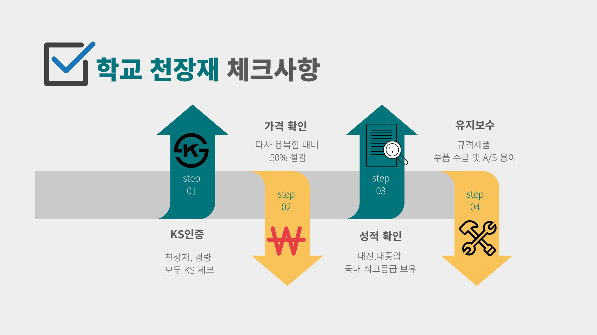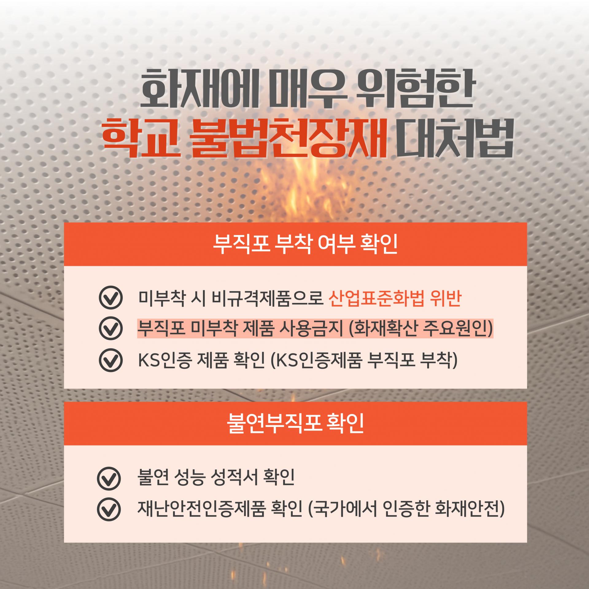 학교 천장재 등 내부 마감재를 점검할 때는 해당 제품이 불연성인지, 그리고 KS인증을 받은 불연 부직포가 부착되어 있는지 반드시 확인해야 합니다. 불연 부직포는 화재 초기 확산을 막는 핵심적인 역할을 합니다.