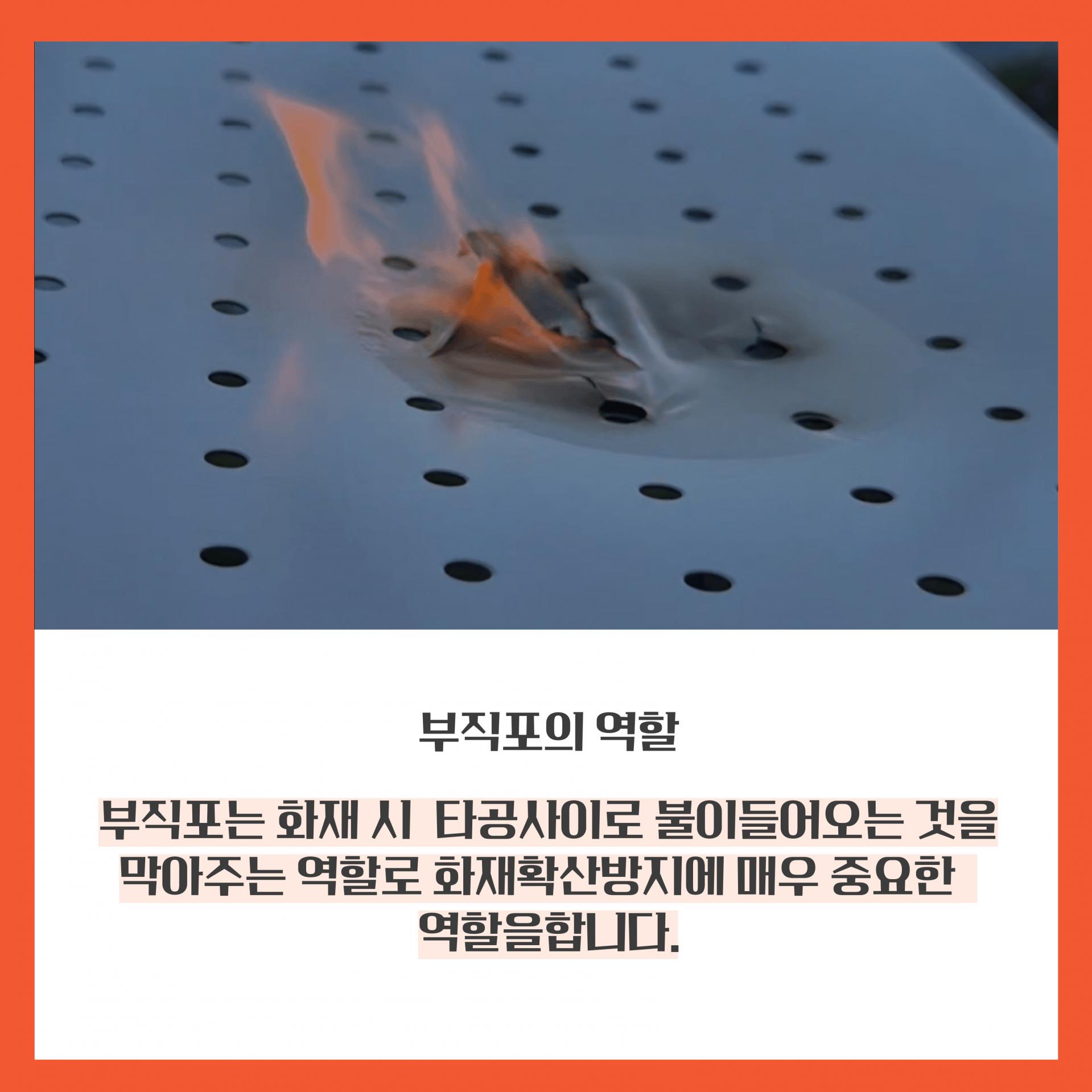 부직포 미부착 시 불길이 천장재를 관통하다보니 천장 속 PVC배관 및 단열재등을 태울 수 있습니다. 또한 천장 속 내부 공간에 화재가 발생 시 타공면 사이로 불길이 떨어질 수 있어, 자동차, 분리수거장 등으로 옮겨 붙을 경우 화재 확산에 주요 원인이 될 수 있습니다.