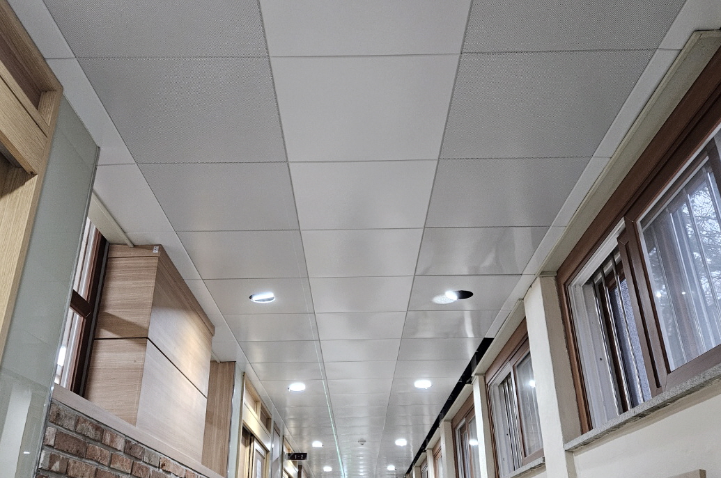 학교의 실내외 교육환경은 학교보건법 제4조 1항 (교사 내 소음이 55DB이하) 에 따른 환경을 적절히 유지관리도록 조성되어야한다는 법조항으로 학교는 반드시 흡음 설계가 매우 중요합니다. 특히 학교는 실내외 모두 소음이 날 수 밖에 없는 환경에 접하고, 별도로 고비용의 흡음 설계를 하기가 사실 쉽지 않습니다. 가장 효율적으로 쾌적한 공간을 조성하기 위해 흡음천장재가 반드시 필요합니다. 천장 전체에 깔린 흡음시스템을 통해 법적 기준 (55DB)이하로 관리가 용이해집니다.