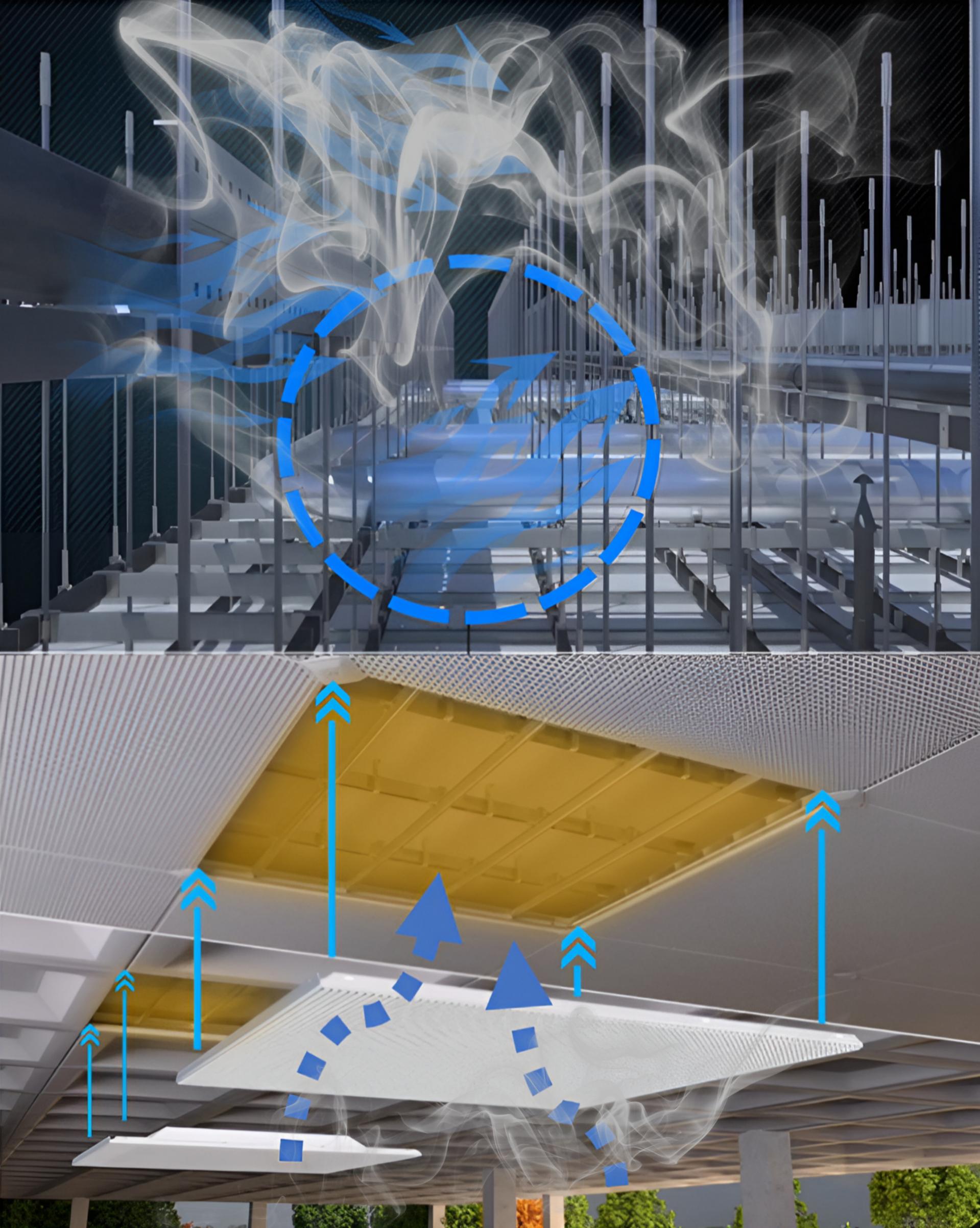 KS SDMC 흡음천장재는 타공 및 개방형 구조를 통해 천장 내부의 공기를 효과적으로 순환 시킵니다.