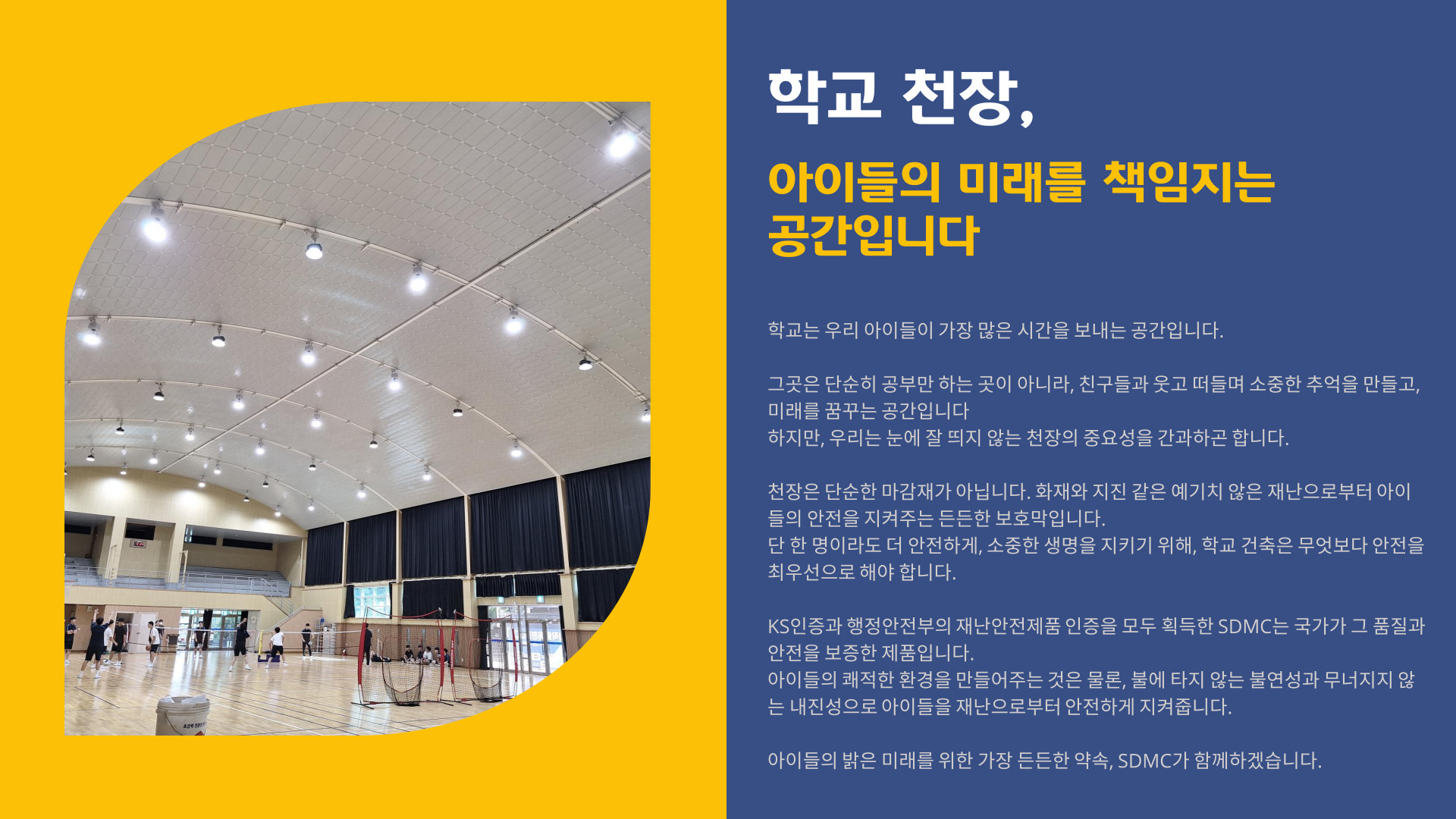 아이들의 안전을 위해 KS SDMC 흡음천장재로 교체하세요.
